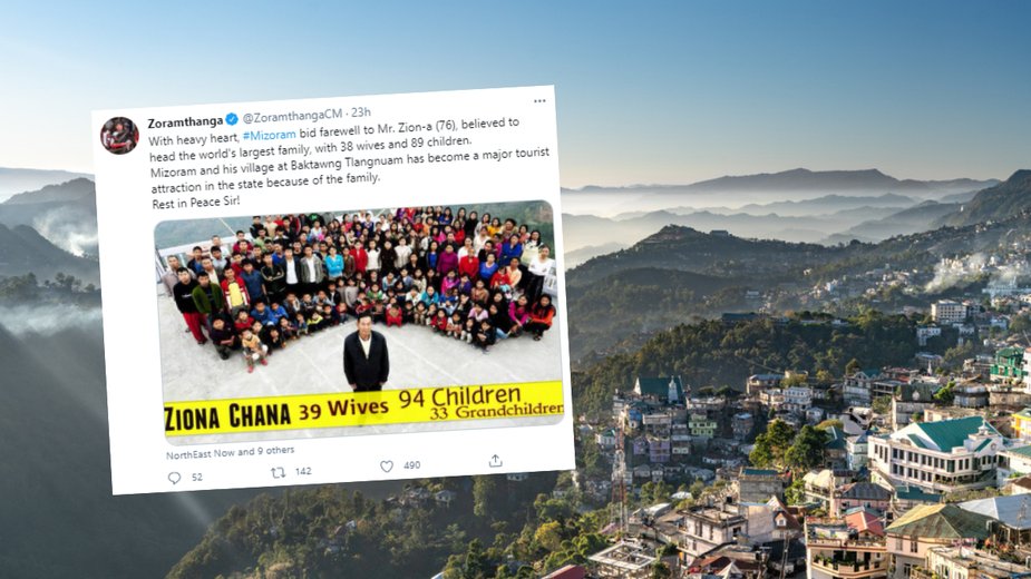 Ziona chana, who is said to be the head of one of the largest families in the world, with 38 wives, 89 children and 33 grandchildren from mizoram, died sunday in a private hospital.